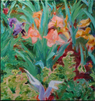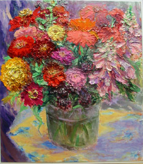 "Zinnias and Bells" 38" x 33" 2002, acrylic on canvas