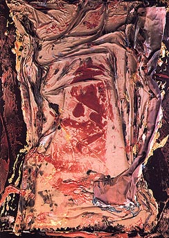"Two Cities" 81" x 62" 1989, acrylic, black gesso & landscape cloth on canvas
